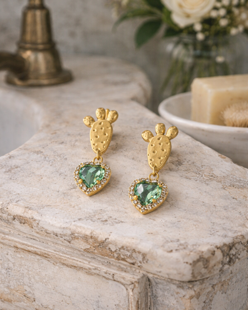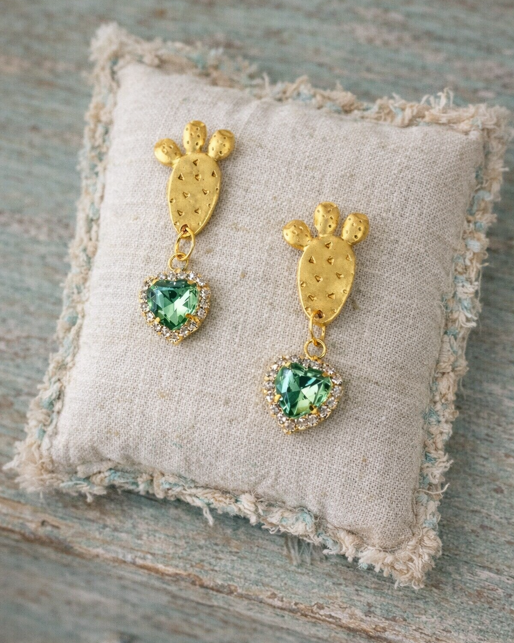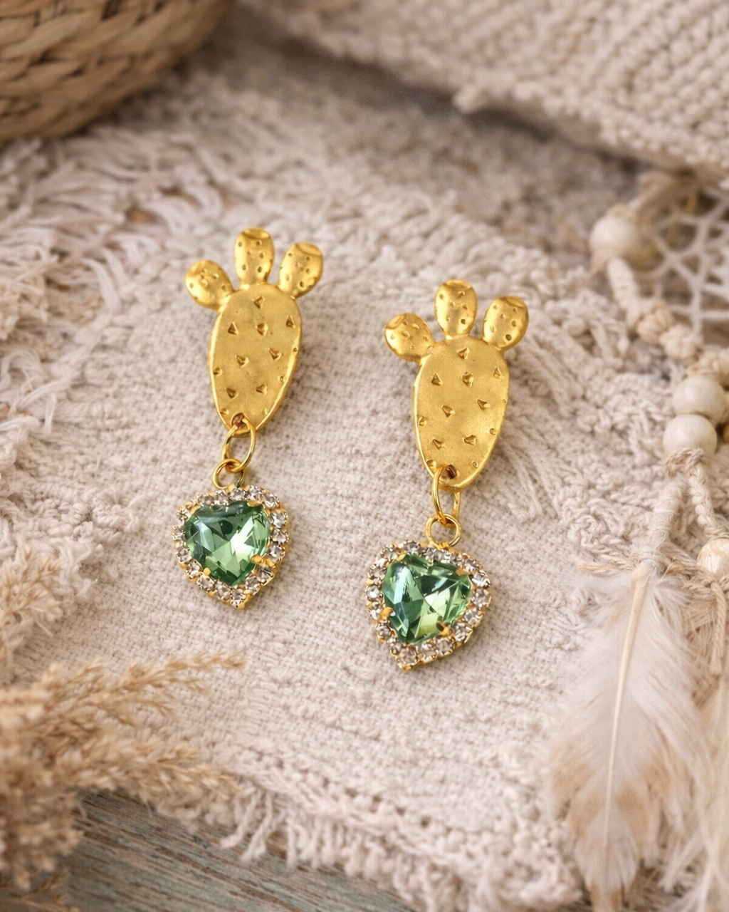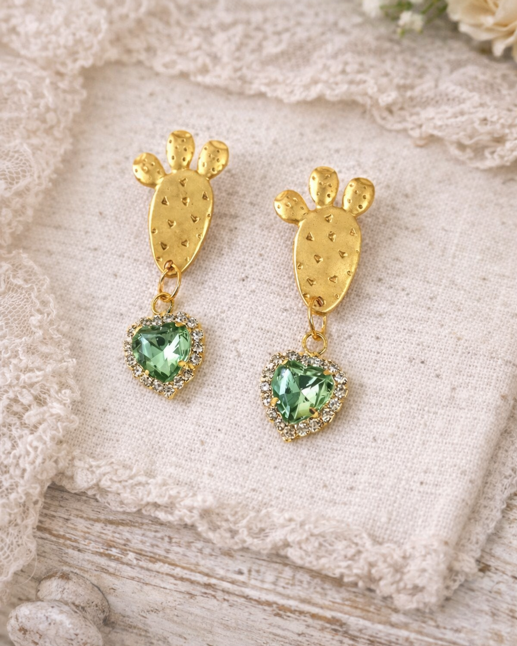 Prickly Pear Earrings with Green Crystal Heart Pendant