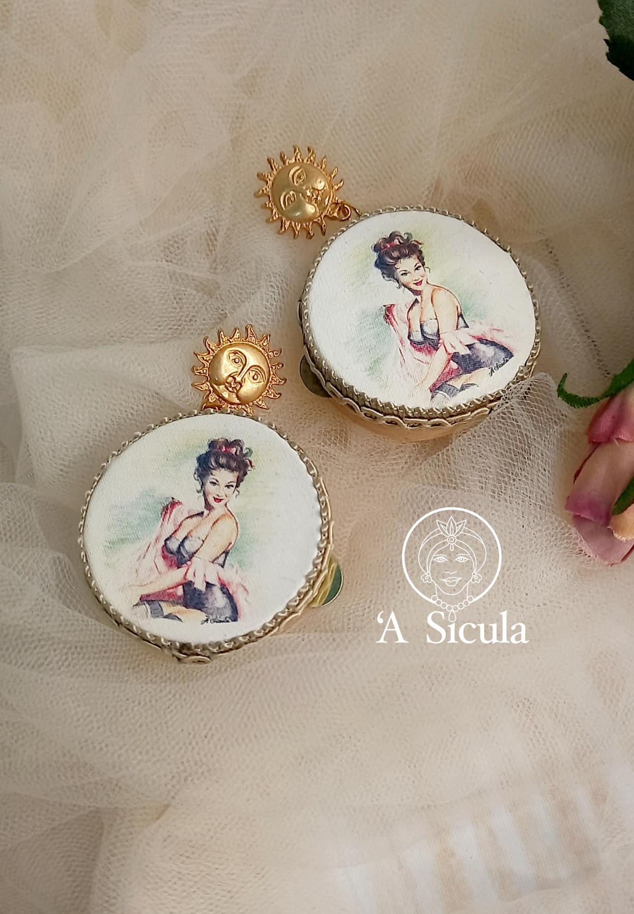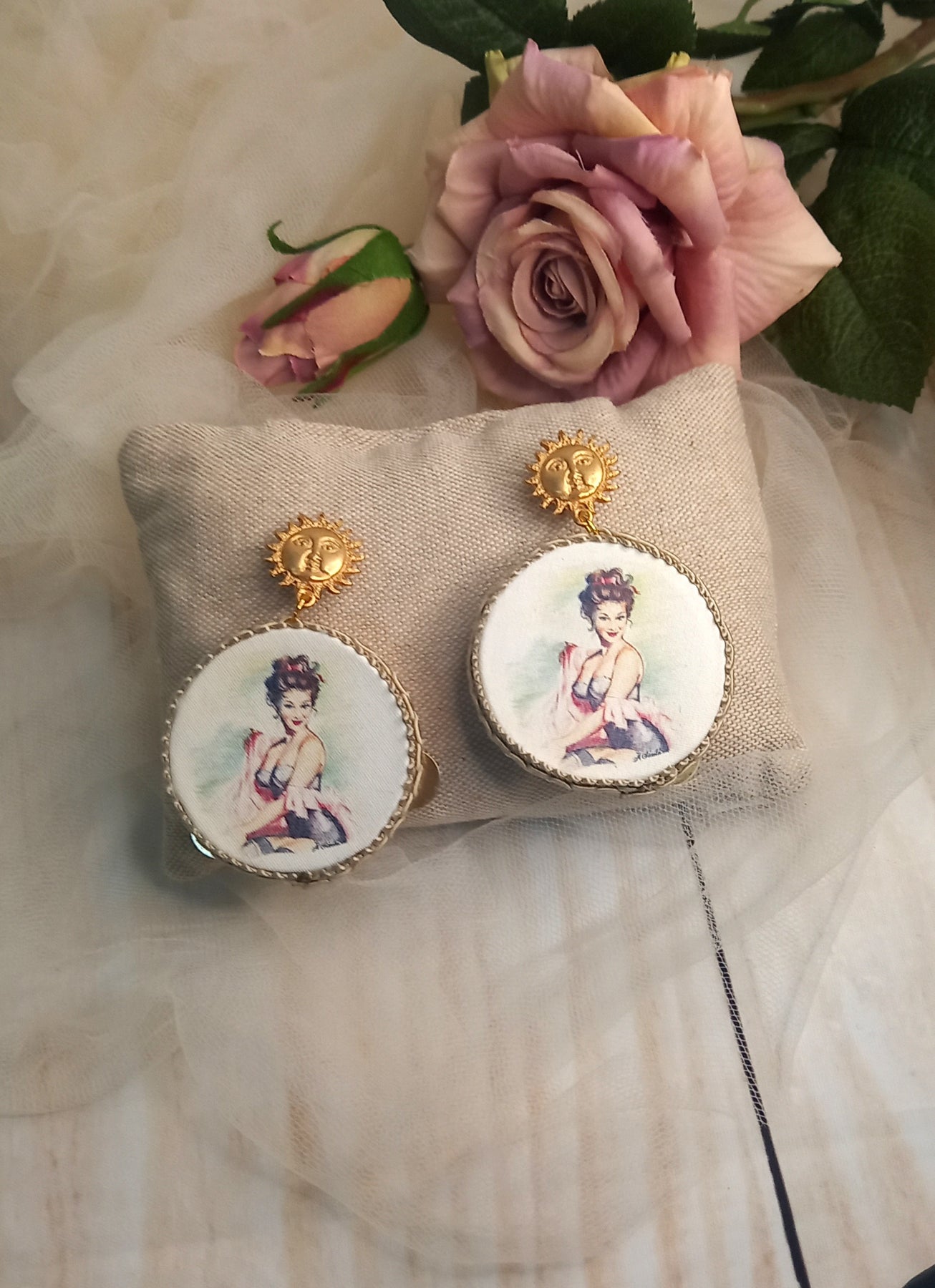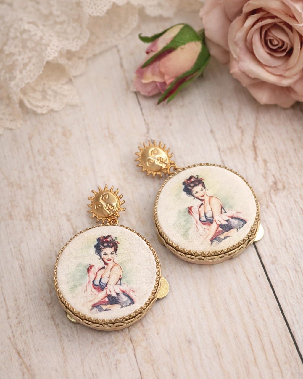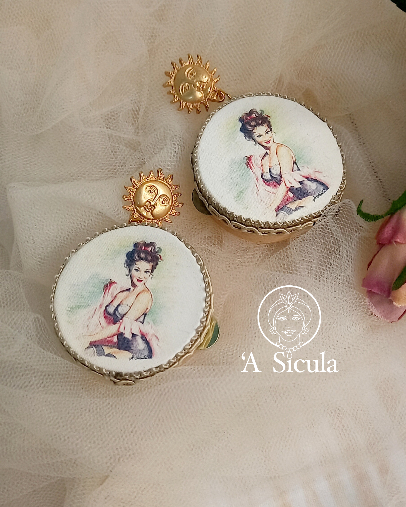 Dangle earrings with tambourine, hand-drawn design depicting a pin-up girl, a very romantic and refined piece of jewelry.