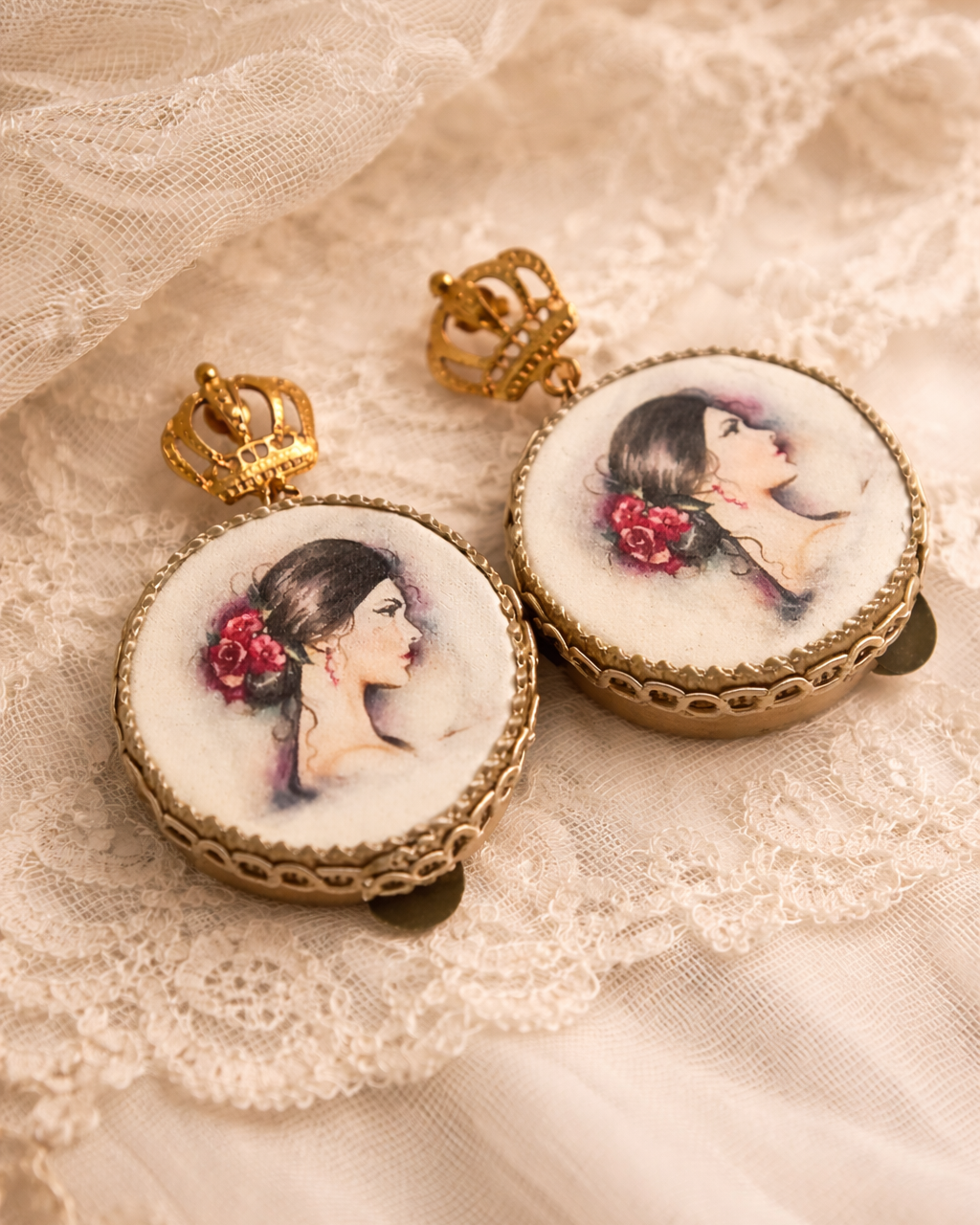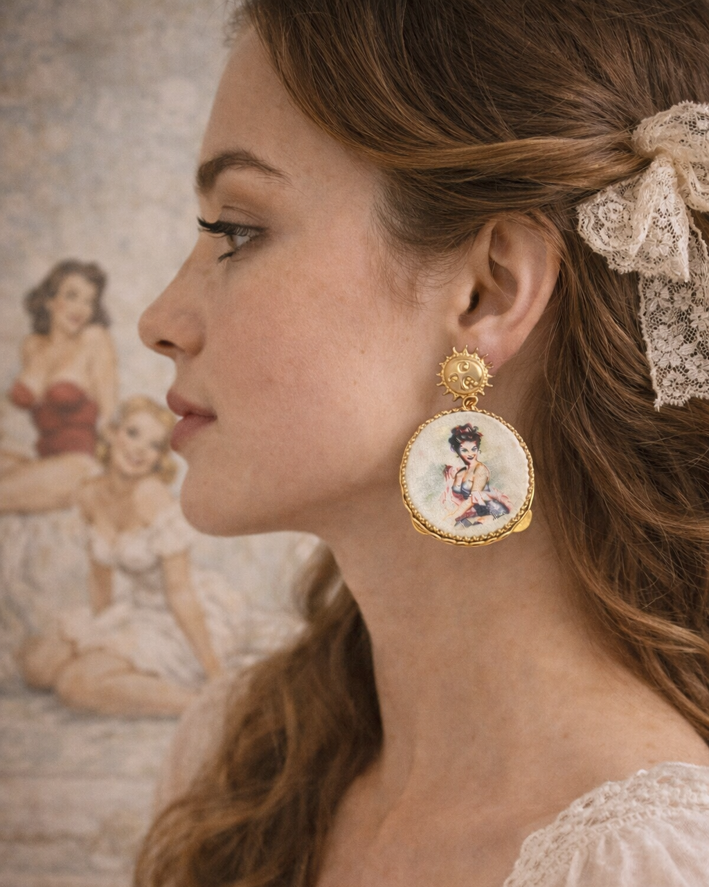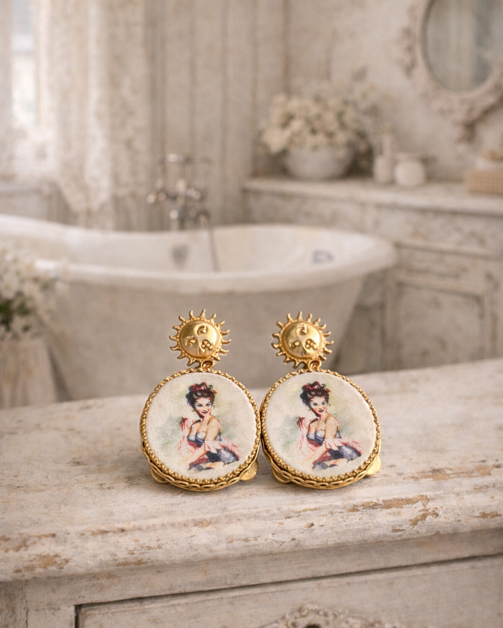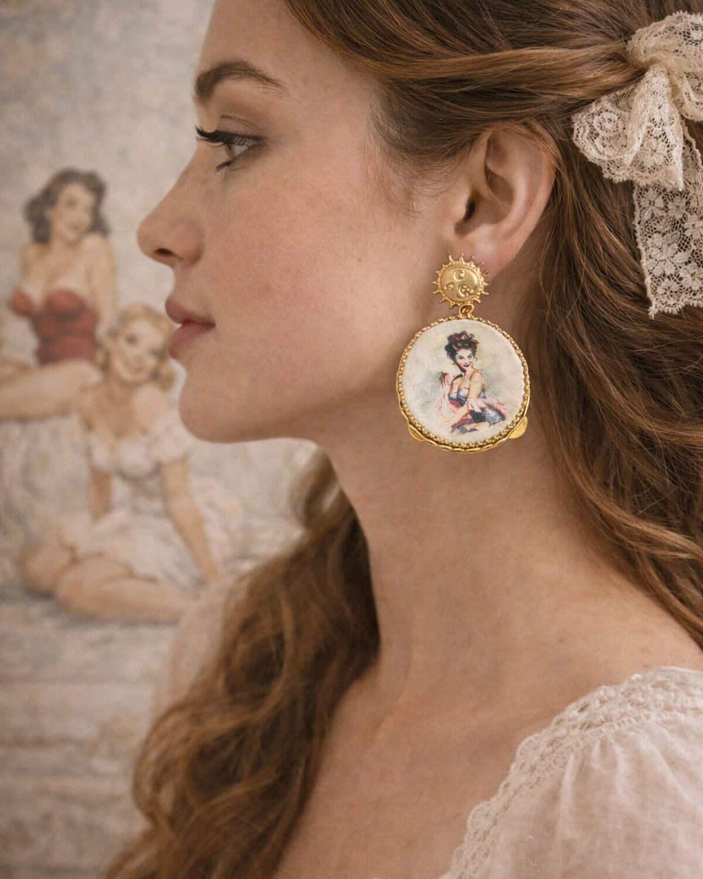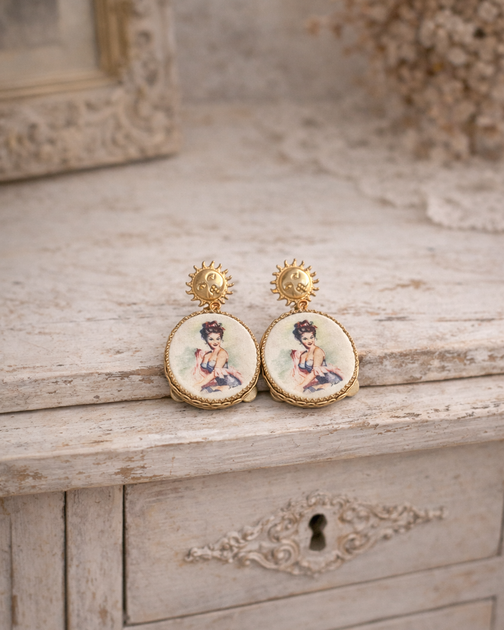 Dangle earrings with tambourine, hand-drawn design depicting a pin-up girl, a very romantic and refined piece of jewelry.