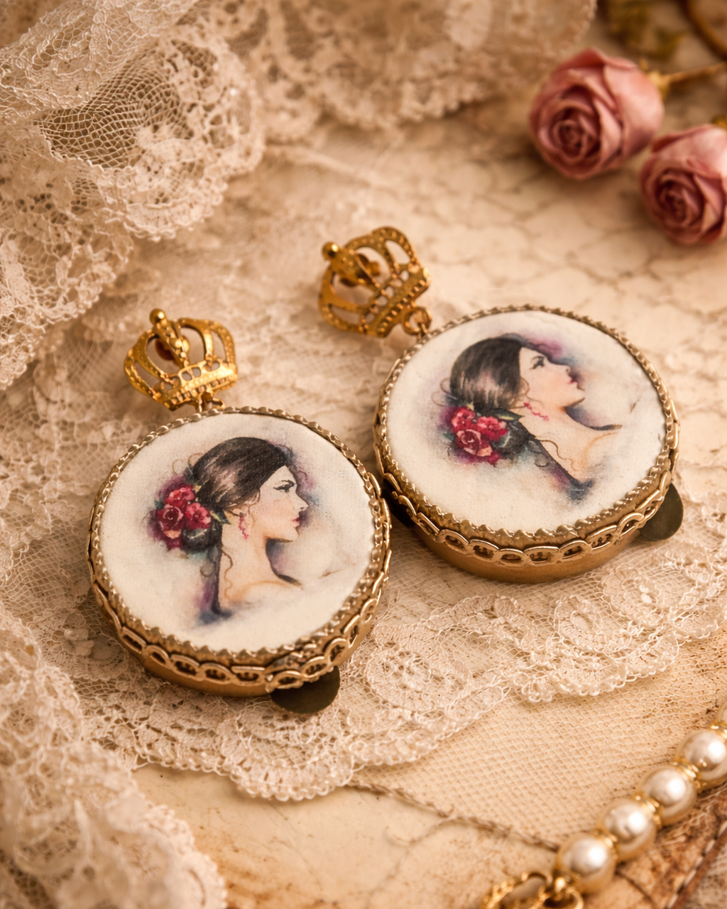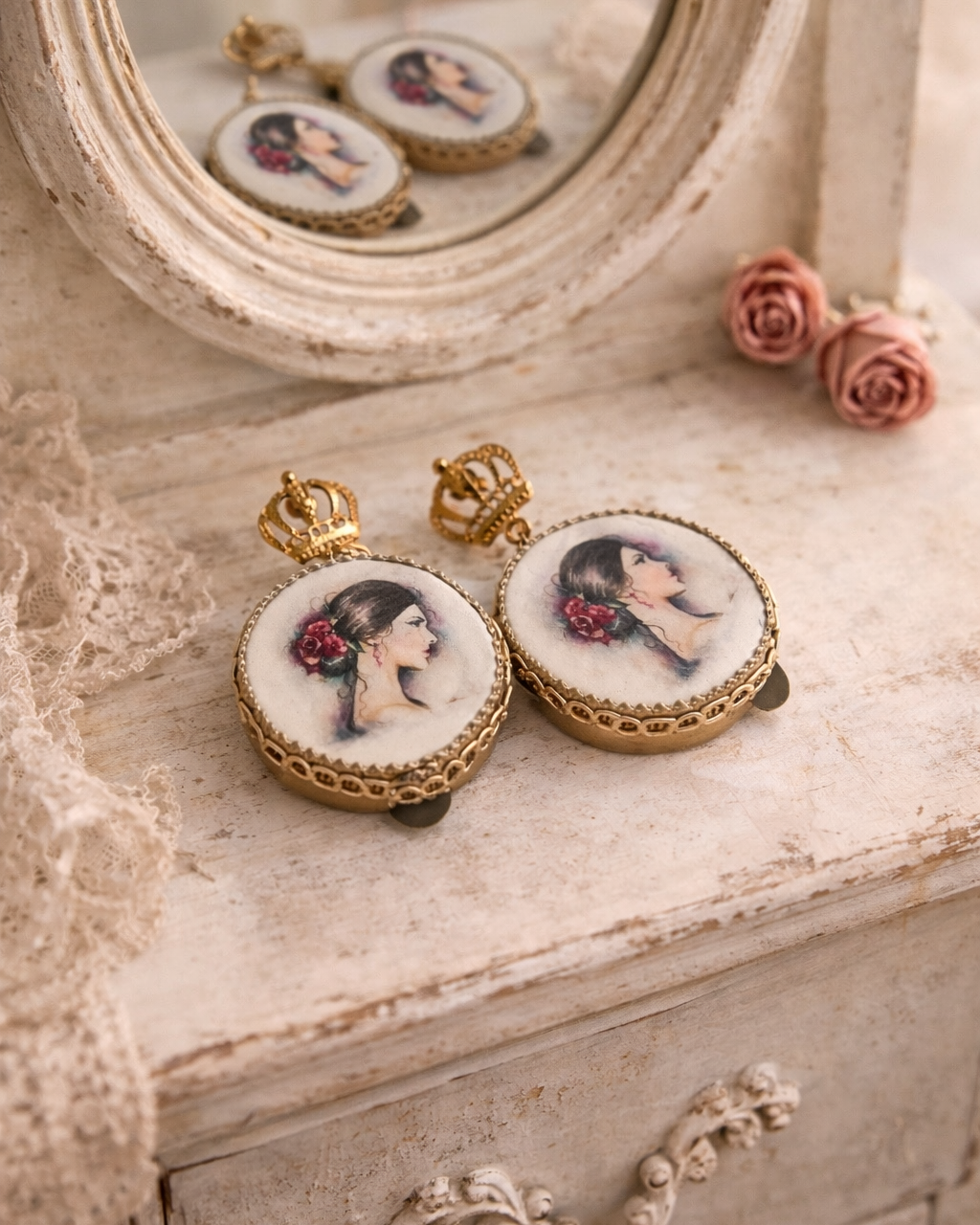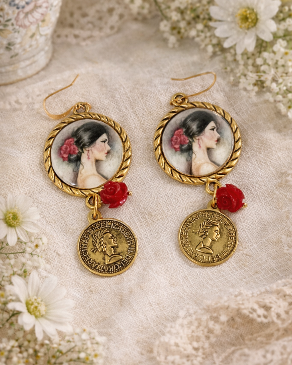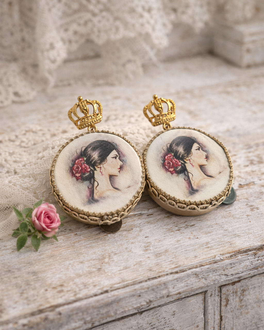 Dangle earrings with tambourine, hand-drawn design depicting a pin-up girl, a very romantic and refined piece of jewelry.