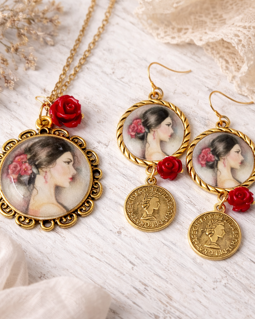 Elegant vintage tamburello earrings featuring a retro woman design, handcrafted from high-quality wood and zamak. Dimensions: 8x4 cm, perfect for a unique and refined look. Authentic craftsmanship and original design to express style and personality.